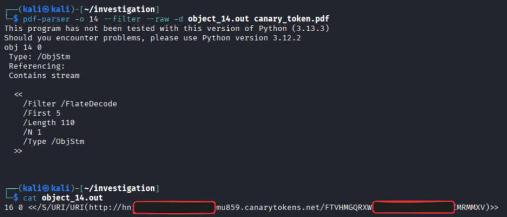 pdf-parser -o 14 --filter --raw -d object_14.out canary_token.pdf