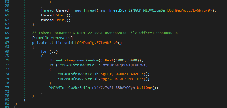 After that, it goes on to set a mutex (this is very interesting for a possible detection!). The name is stored as a constant in the class MXCTJAFfBDewIkVKh and decoded from Base64 it is:oasXy7KPgPYnkUoL