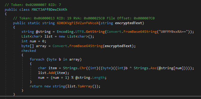 Still, I was curious, what exactly is happening in the class, which holds the value checked in that if-block and I saw a strange function in the initialization, which does base64 encoding and xoring of values so I looked into it. (Thanks to that I’m gonna present you the next IOC in a second)