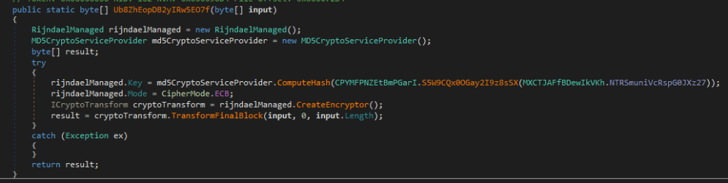 It’s encrypting using the RijndaelManaged (AES) class in ECB mode, so with knowing the key it’s possible to decrypt it again as ECB mode doesn’t have a IV-key.