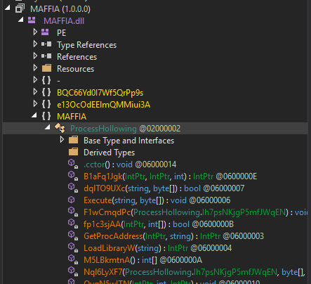 I looked at the function which is called from the powershell script (see above). It calls MAFFIA.ProcessHollowing.Execute()-function. So I went to see, what this function does: